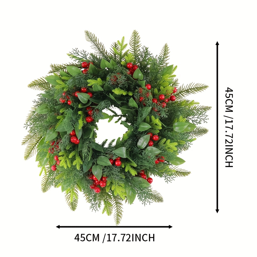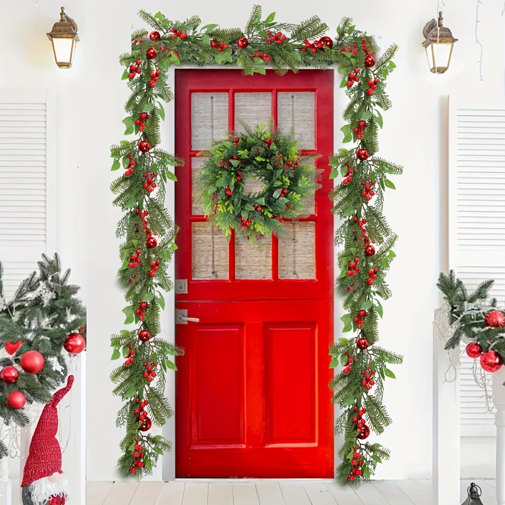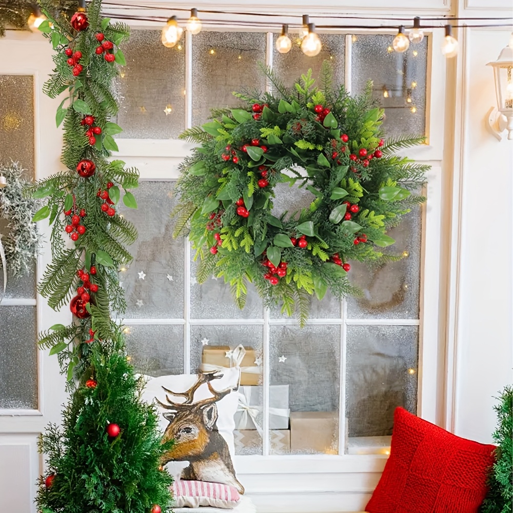 Christmas Wreath & Vine Imitation Frosted Pine Needles with Red Berries, Suitable for Indoor and Outdoor Fireplace, Door and Wall Holiday Party Decorations